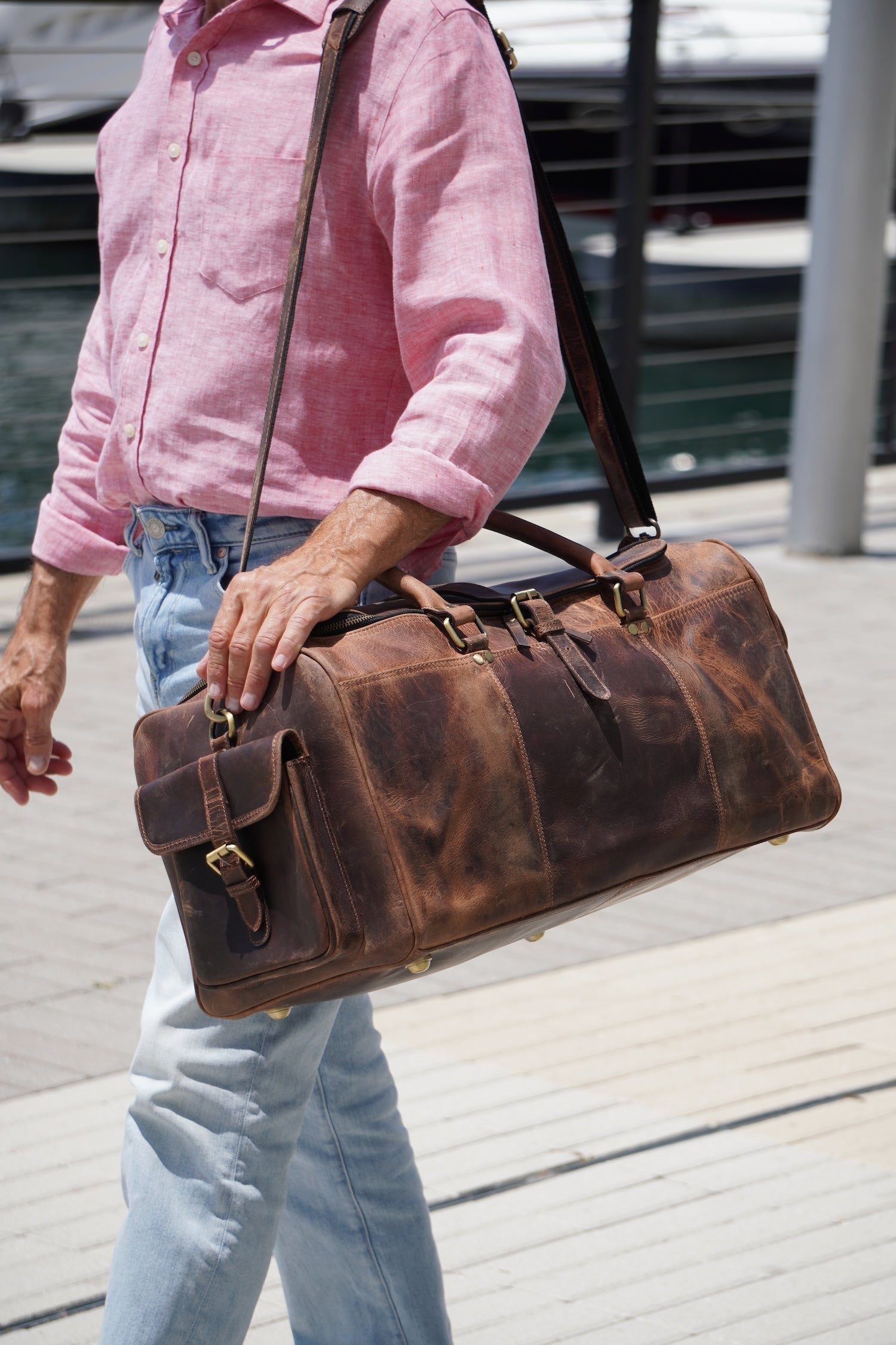 Crafted with 100% full-grain leather. The Domenico 2 Pocket is a bold, structured duffle that reimagines traditional travel silhouettes. With two sculpted side pockets, a curved top zipper protected by a full leather strap closure, and a confident rectangular shape, it's built to impress from the tarmac to the terrace.