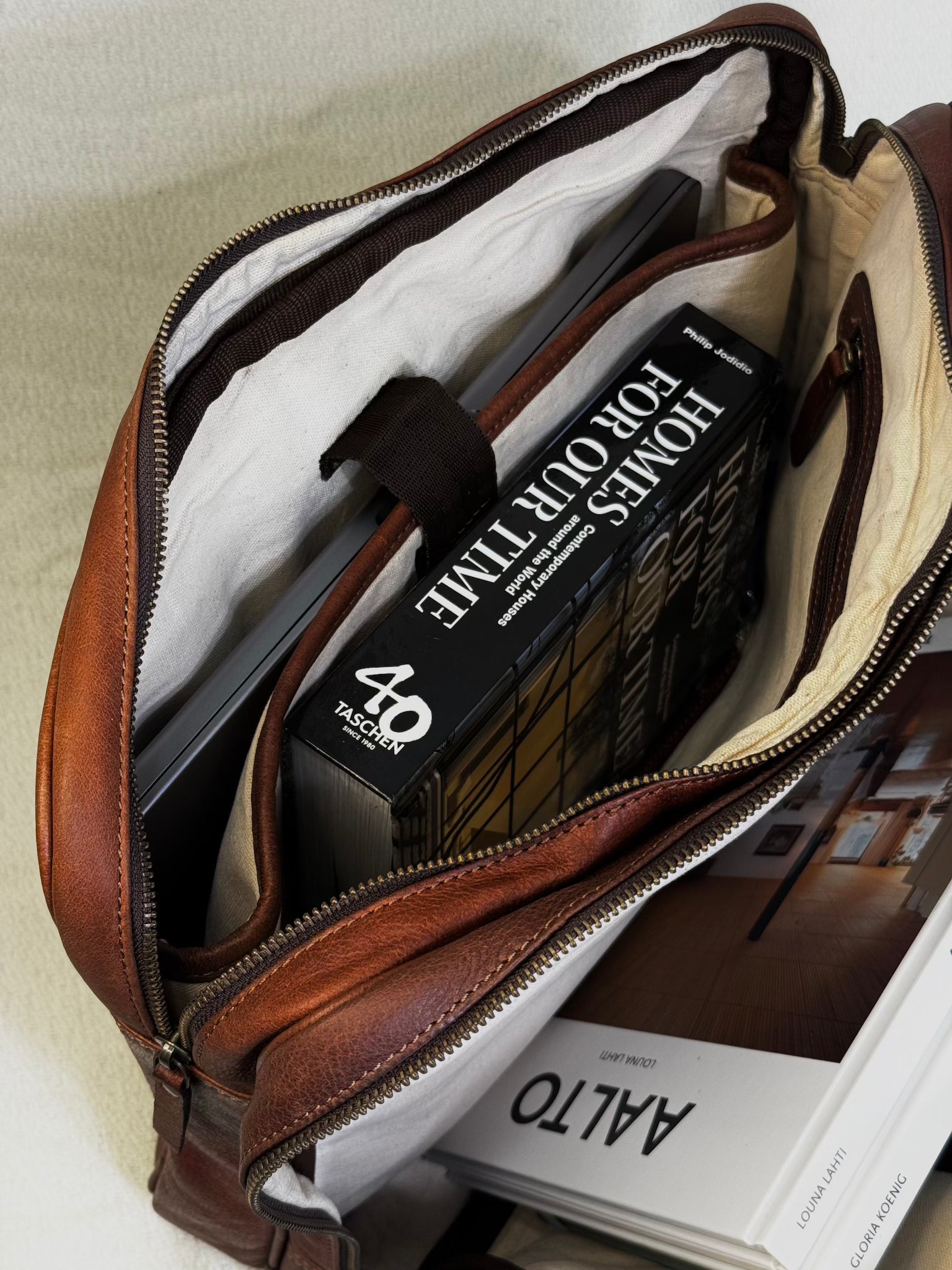 Made with 100% full-grain leather, the Milano Linea is defined by its clean two-tone detailing, a slim leather layer that wraps the handles and underlines the body with architectural grace. Sized at 15.5x12x4 inches, it’s structured, versatile, and beautifully balanced.